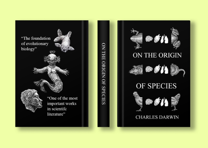 i chose to recreate darwin's classic "on the origin of species" using traditional illustration to highlight the scientific nature of the book, while still trying to add a more modern and creative feel. the cover represents the common organs that many animals share, and the faces inside the book are modeled after the stages of a embryo's development. evolution can be traced by looking at the shared traits of embryos across species, so it felt fitting to use for this book, especially given their more surreal appearance.