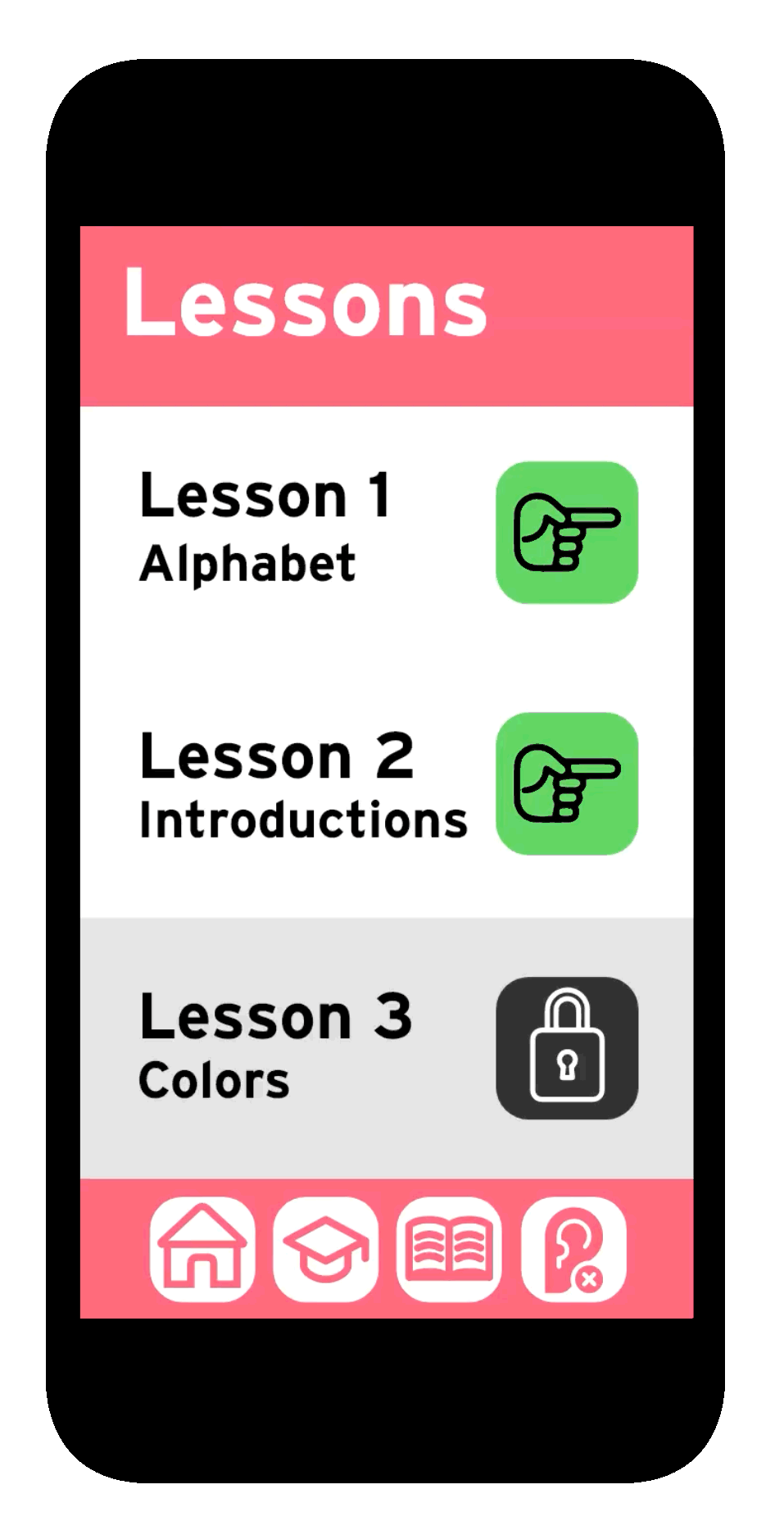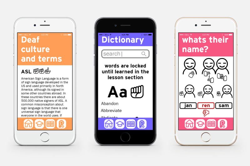 i created an app prototype for learning american sign language, utilizing the methods of popular language learning apps. i wanted a clean and simple graphic style that made the language learning process seem less intimidating, and to not distract from the main content. the app focuses on not only teaching the user the language itself but gives a history of the language and its use.