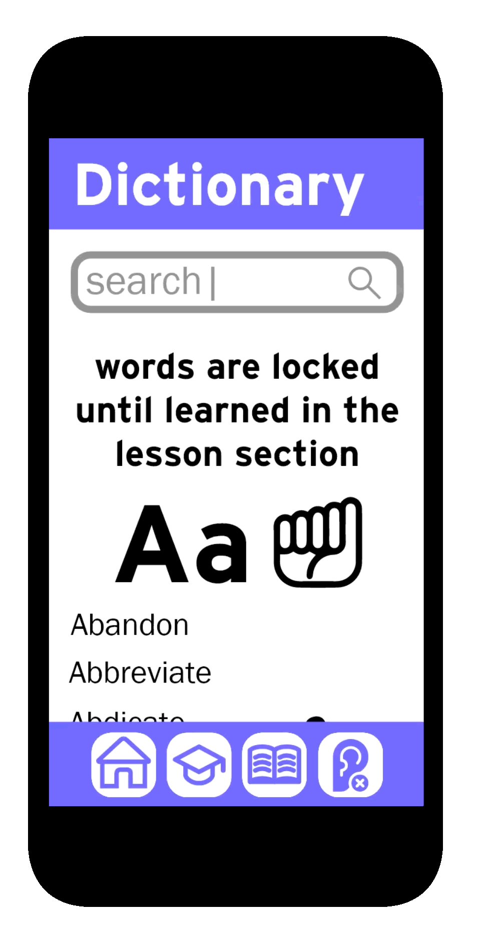 i created an app prototype for learning american sign language, utilizing the methods of popular language learning apps. i wanted a clean and simple graphic style that made the language learning process seem less intimidating, and to not distract from the main content. the app focuses on not only teaching the user the language itself but gives a history of the language and its use.